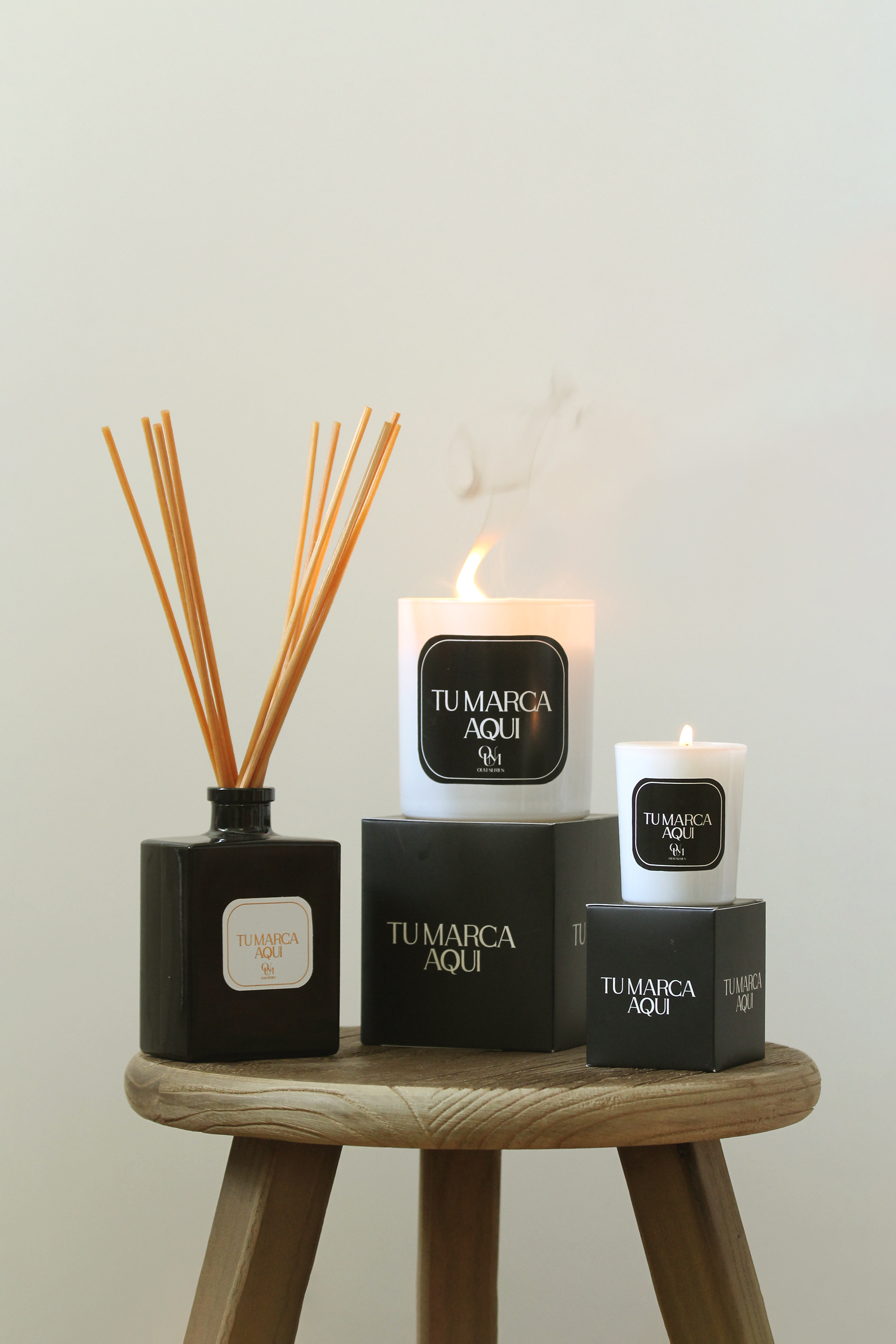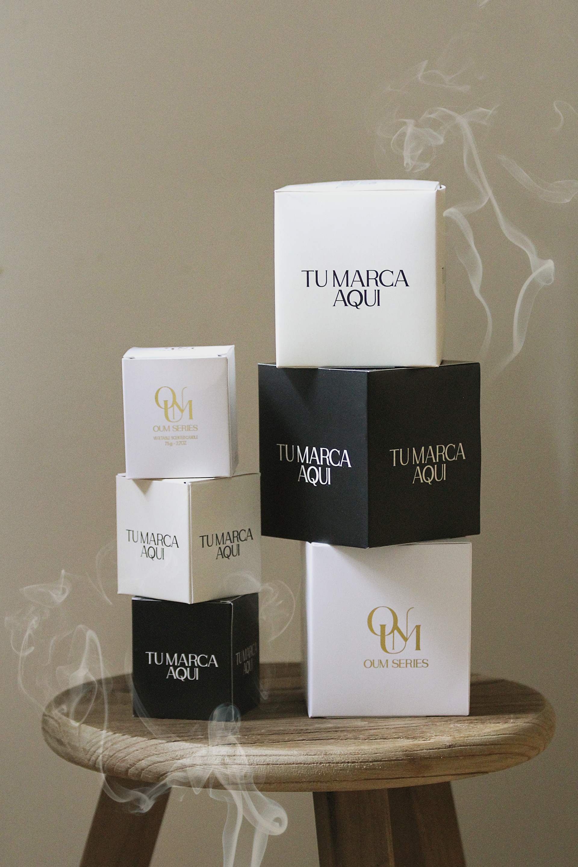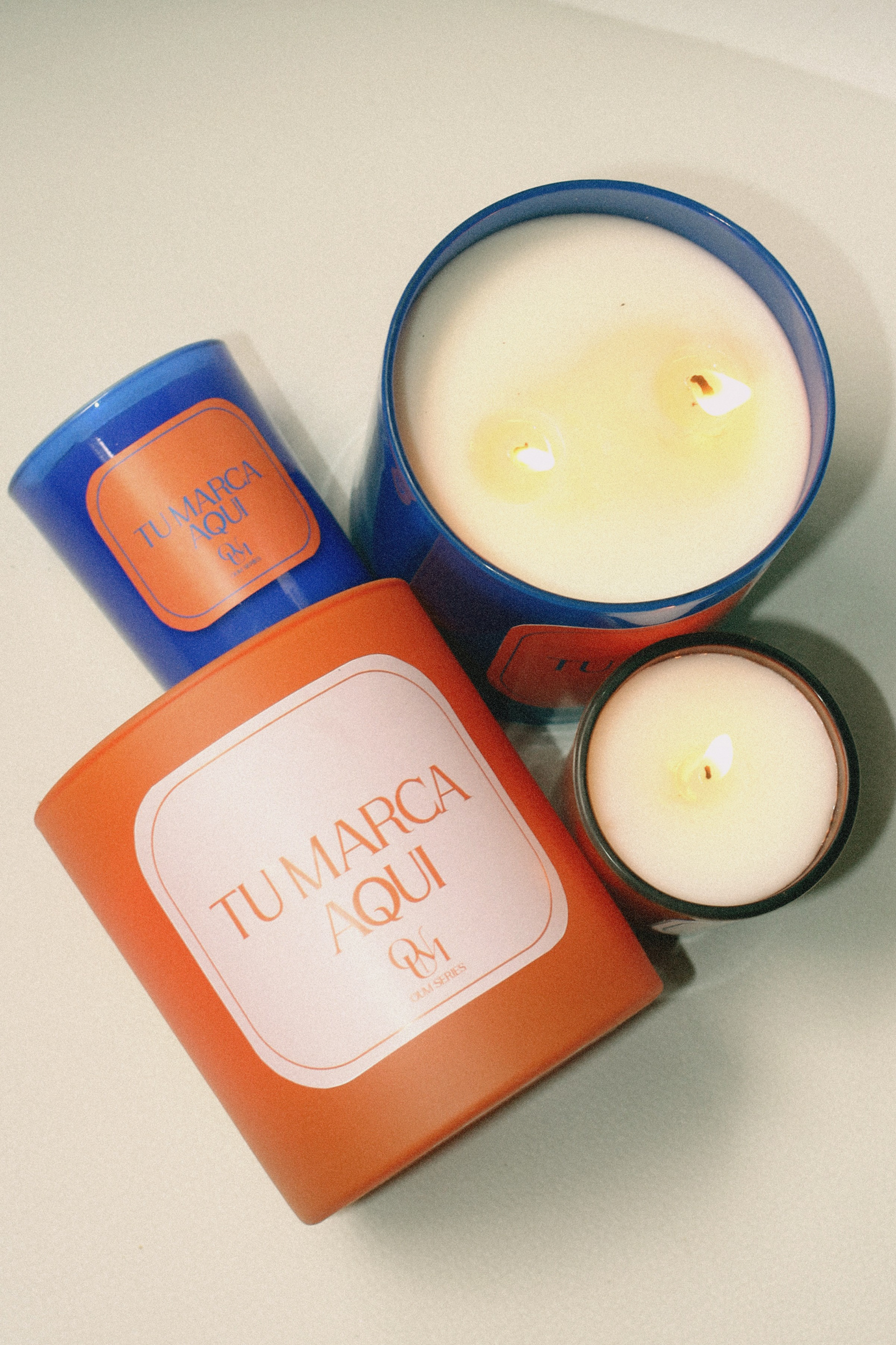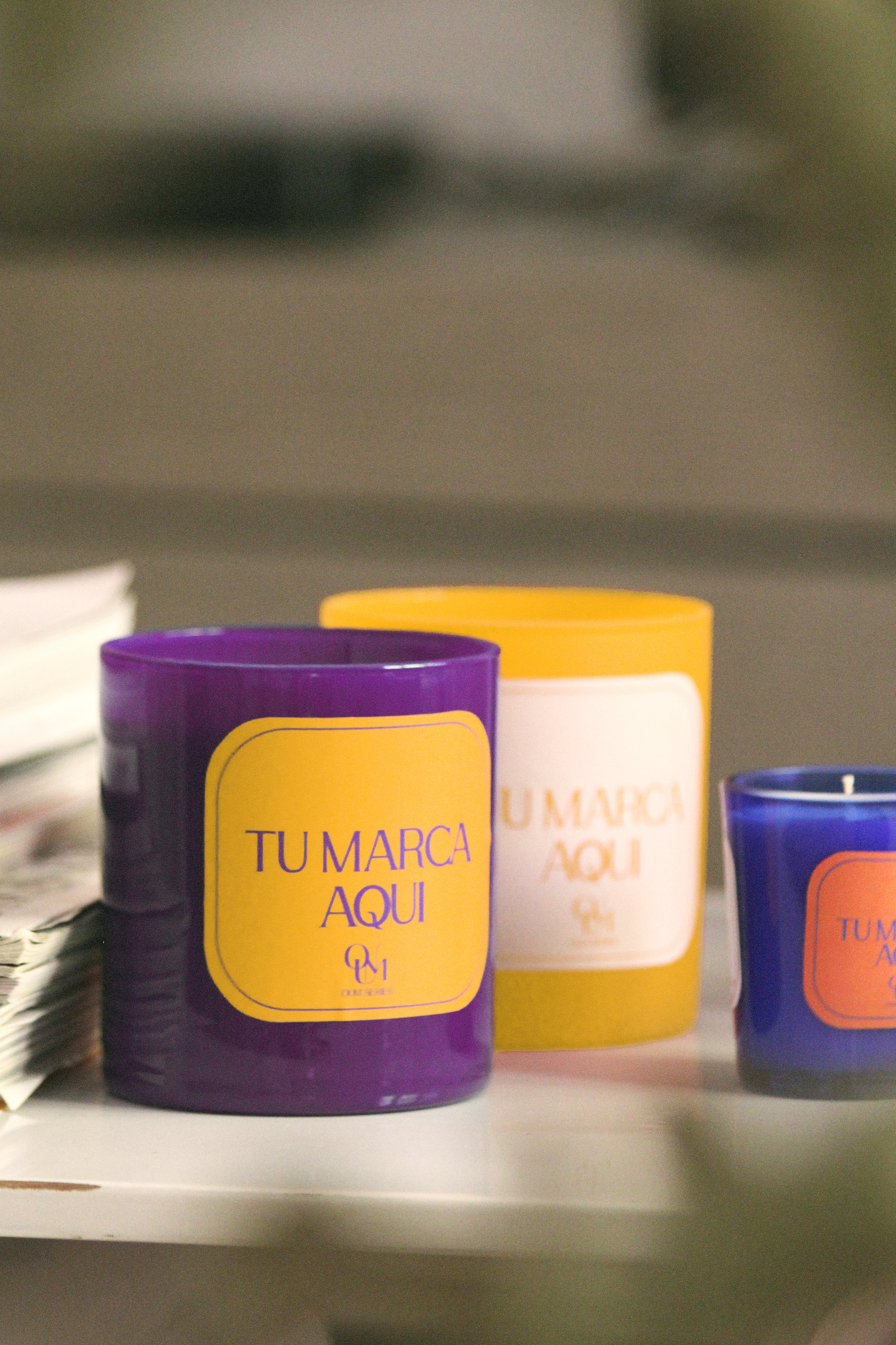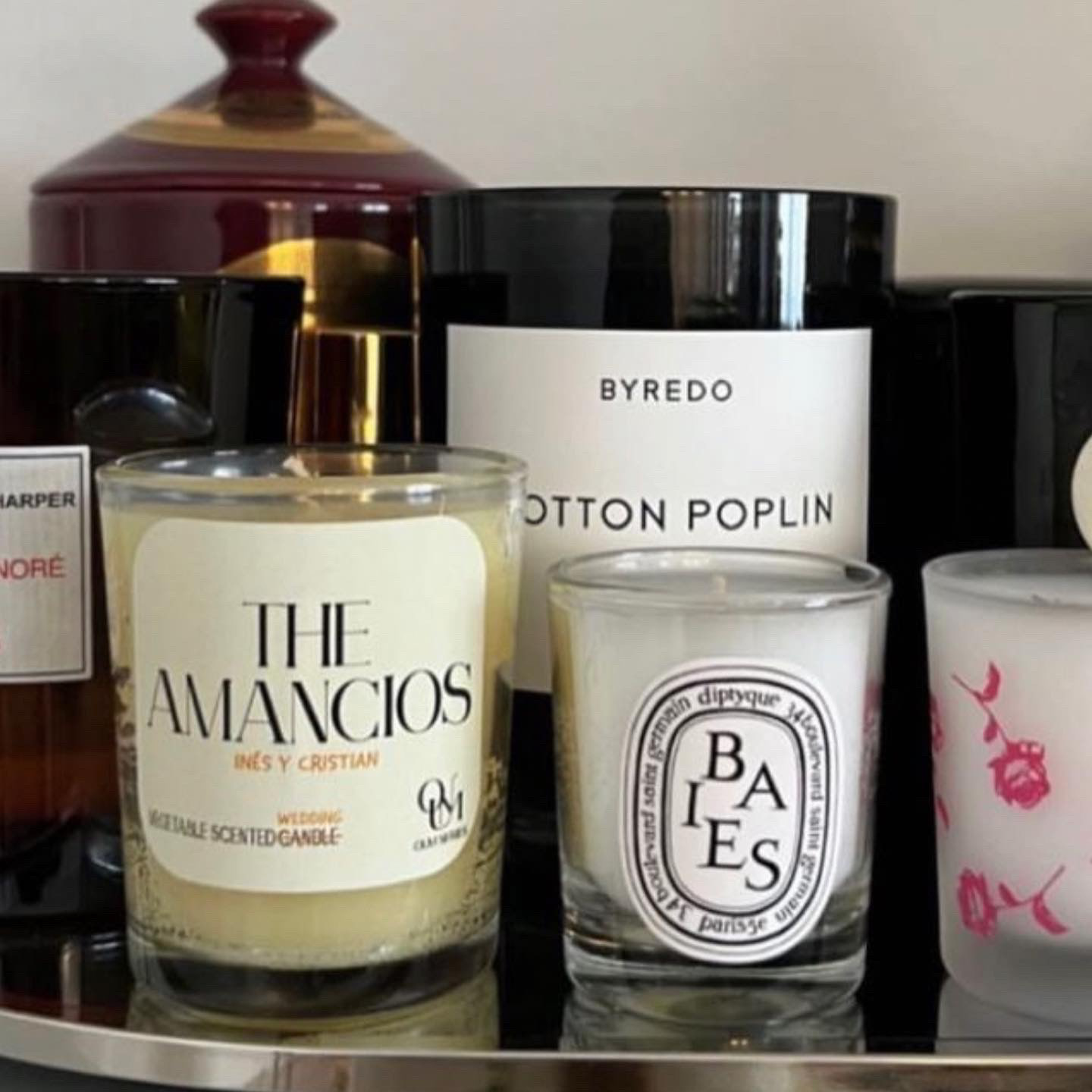 Here’s an example of our first personalized candles for the guests of influencer Inés Arroyo’s wedding. I designed a candle model featuring the wedding date inscribed on the box in a handwritten font, along with our brand font for the name her friends call her, “the Amancios.”